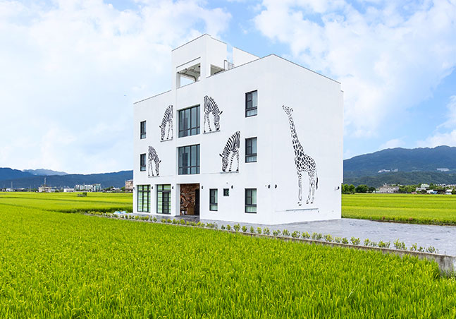 「武暖ZOO親子民宿(2館)」位於宜蘭礁溪鄉,外牆上吸睛的斑馬、側牆的長頸鹿以及3層樓高的溜滑梯是一大特色。